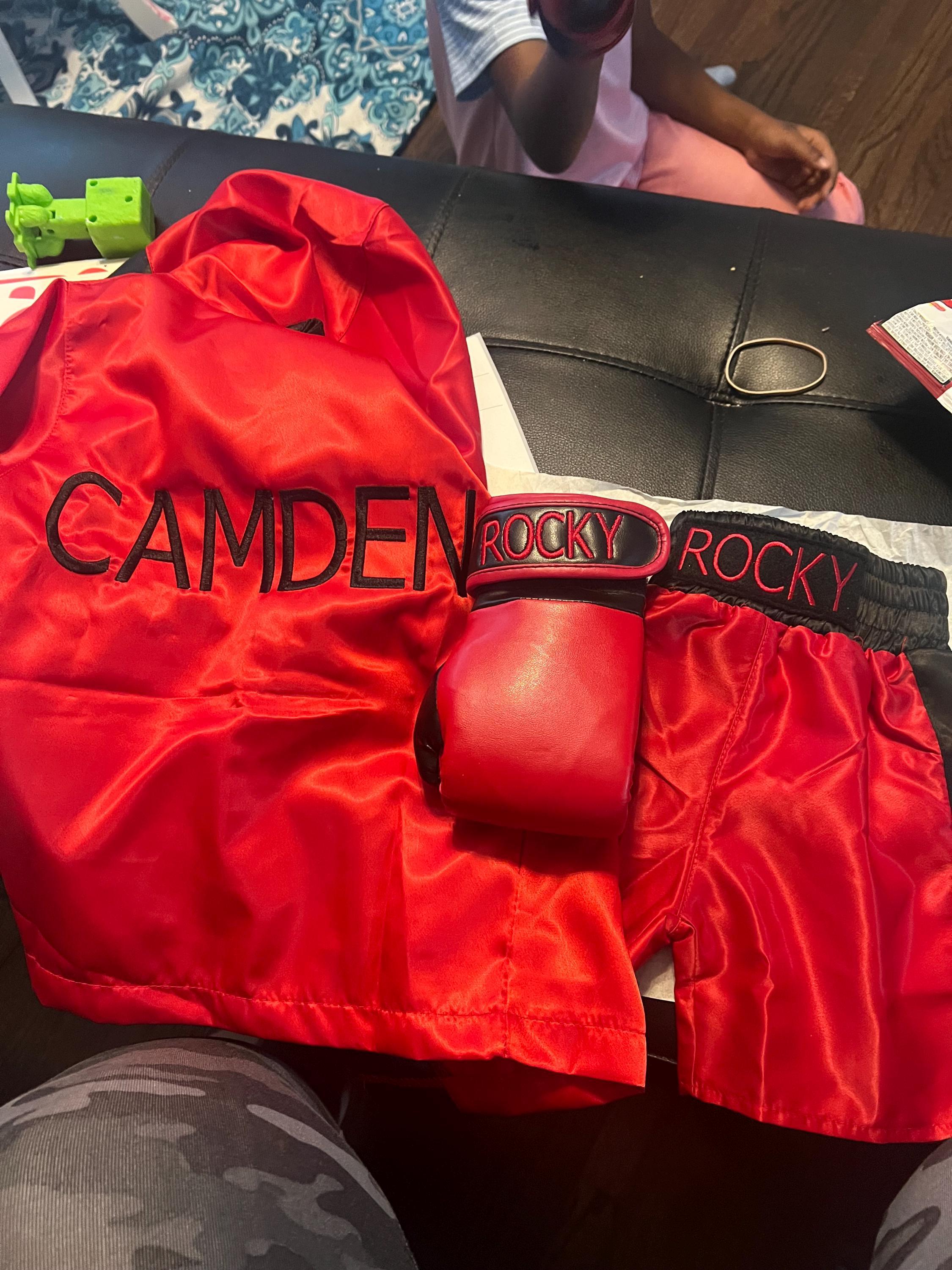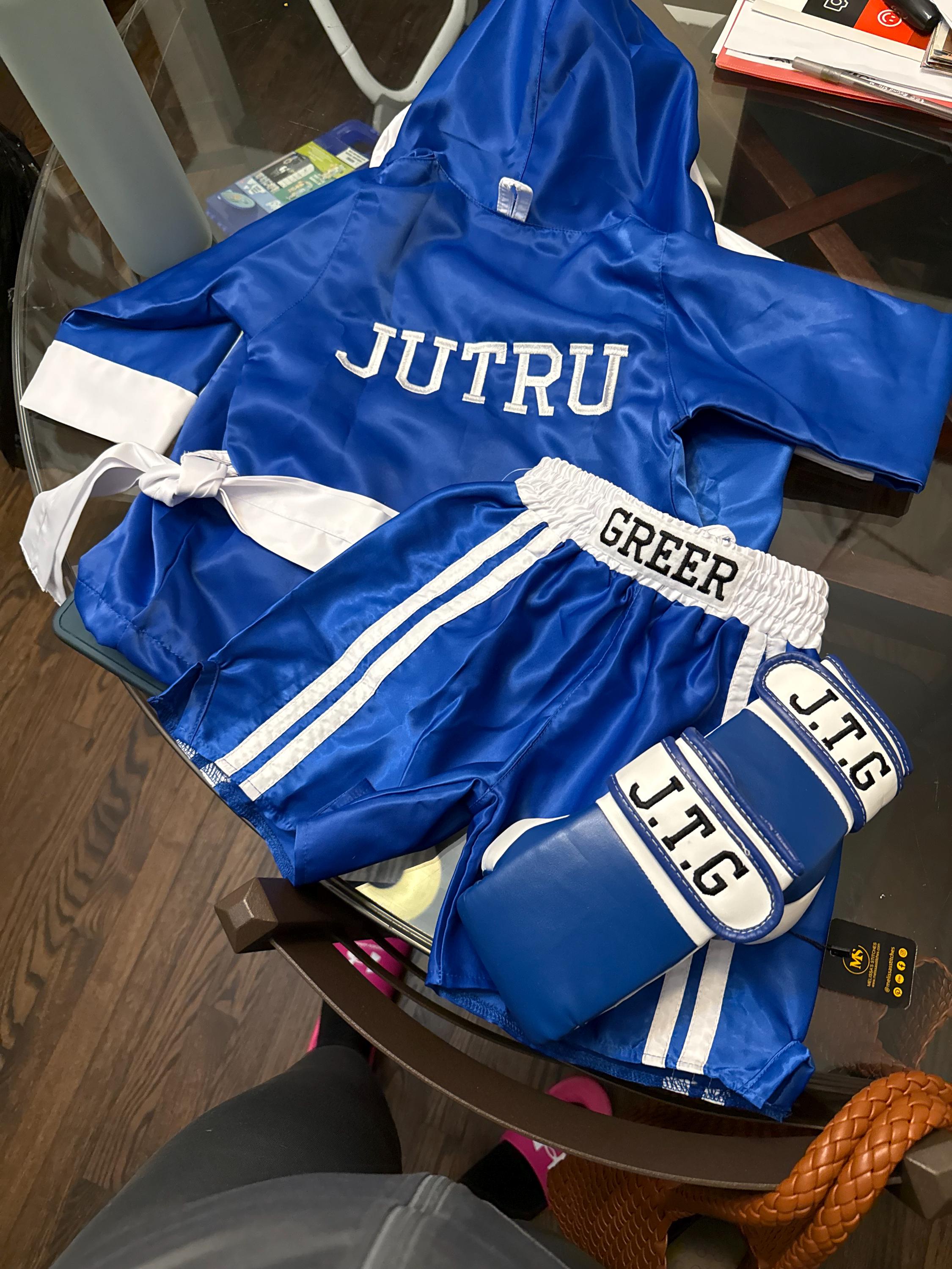 This listing allows you to select individual items (robe, shorts, or gloves) OR the complete boxing set.