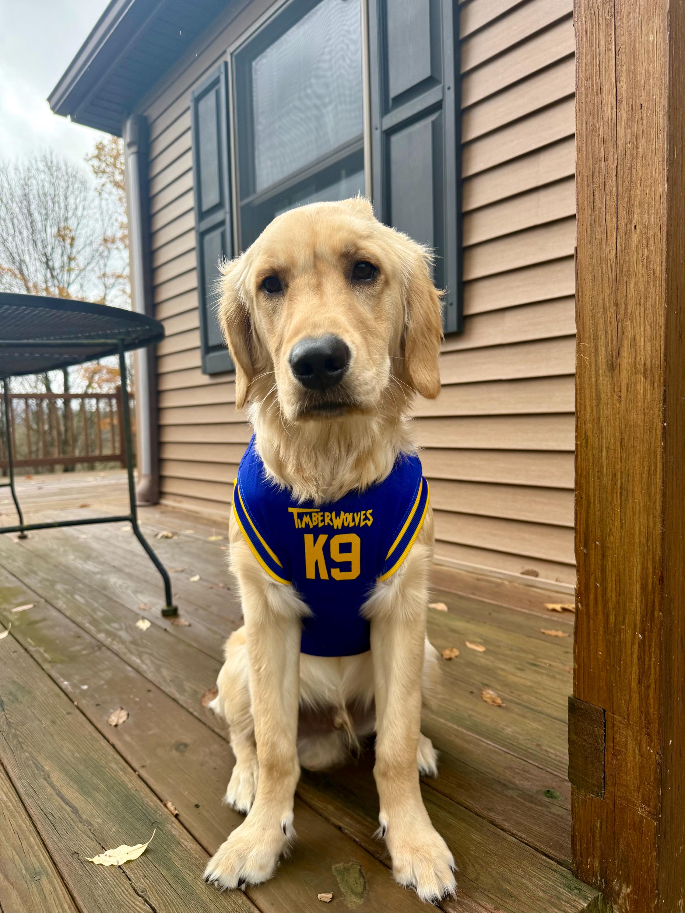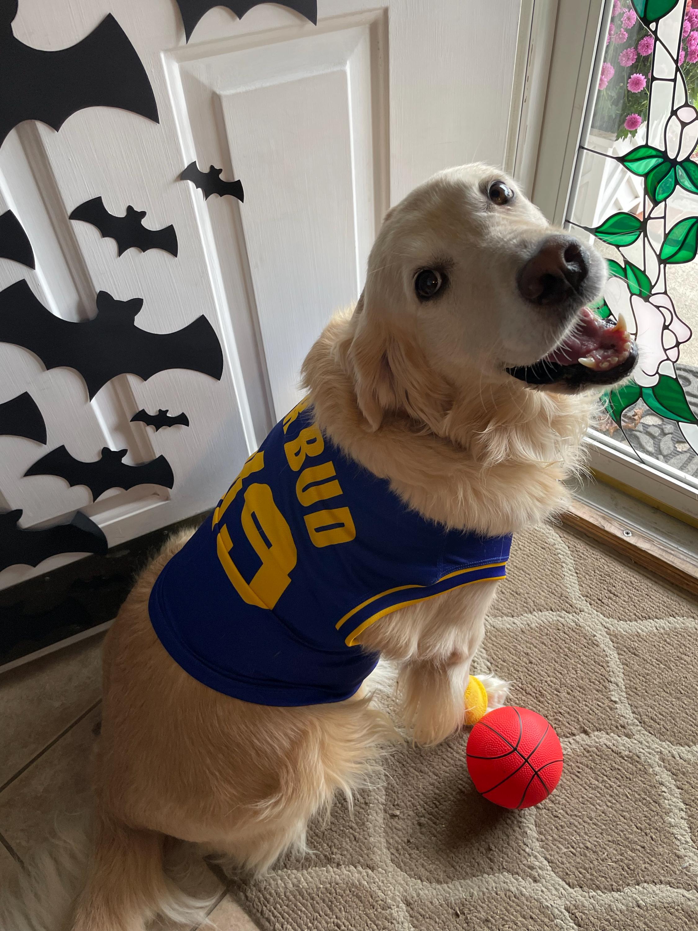 Arrived way before scheduled and looks exactly like the pictures! I’ve had this (probably unoriginal!) idea for my golden retriever to be Air Bud for a year now and was so excited to find a jersey that was such high quality. We’ve gotten so many compliments on Winnie’s costume already! She’s about 90 pounds and the 3x was perfect!