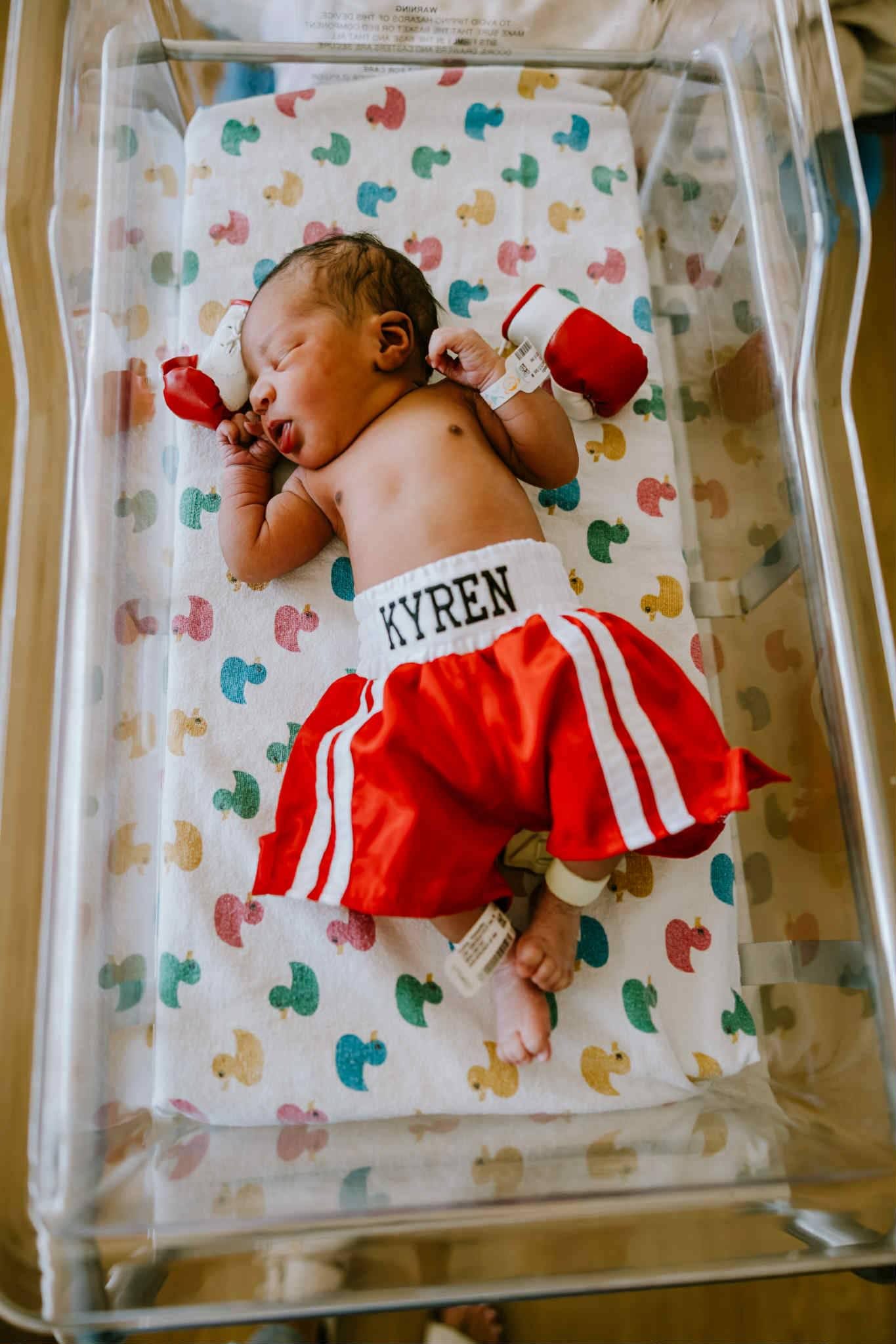 Please note that these gloves are props and won't fit your baby's hands. For baby-sized gloves that your little champ can wear, please check our listing options or send a message for a special order. Please add the size you would like at the checkout comment box to seller, along with the name. If no size has been chosen, we will send you the Newborn size. Thank you