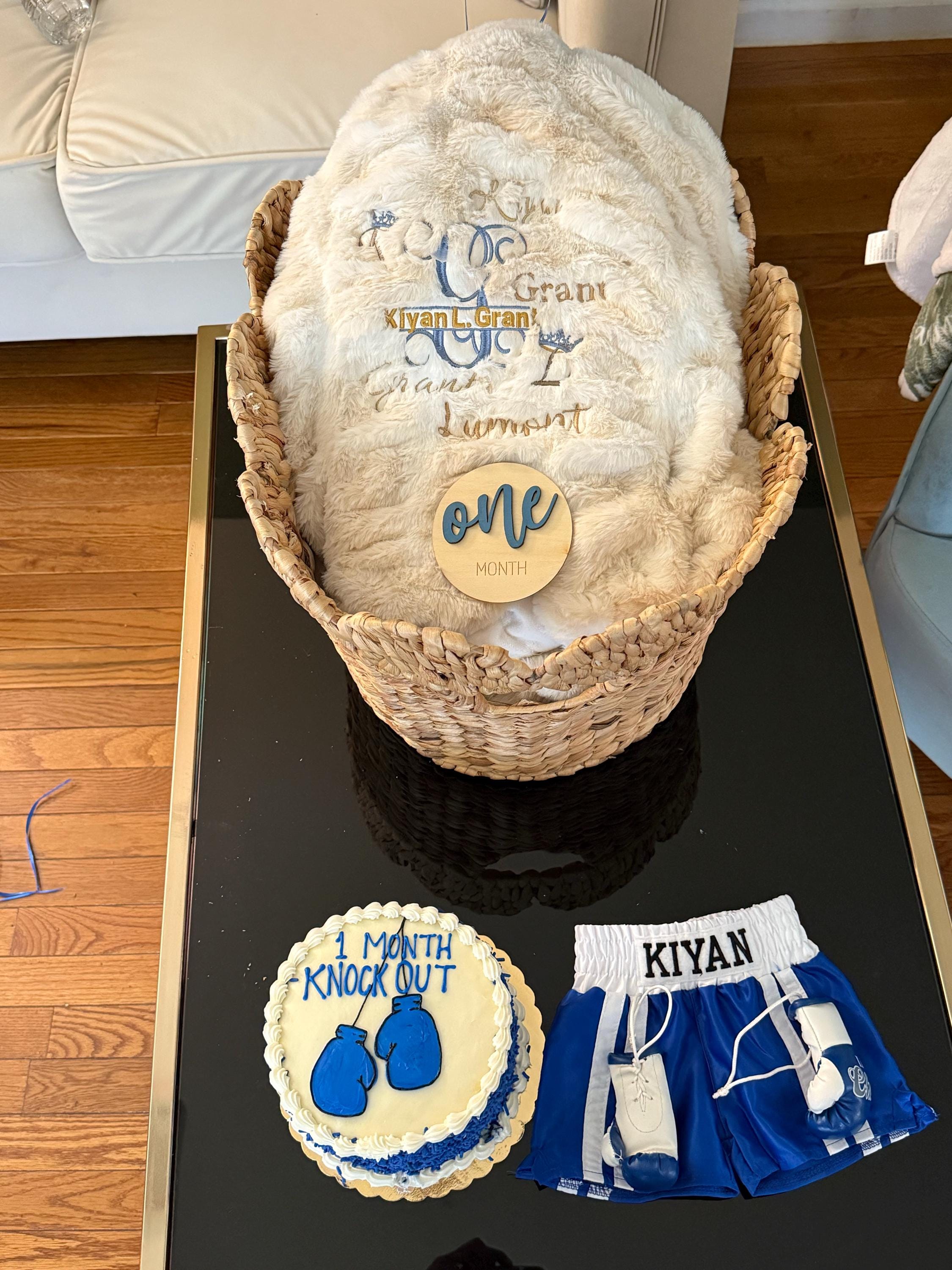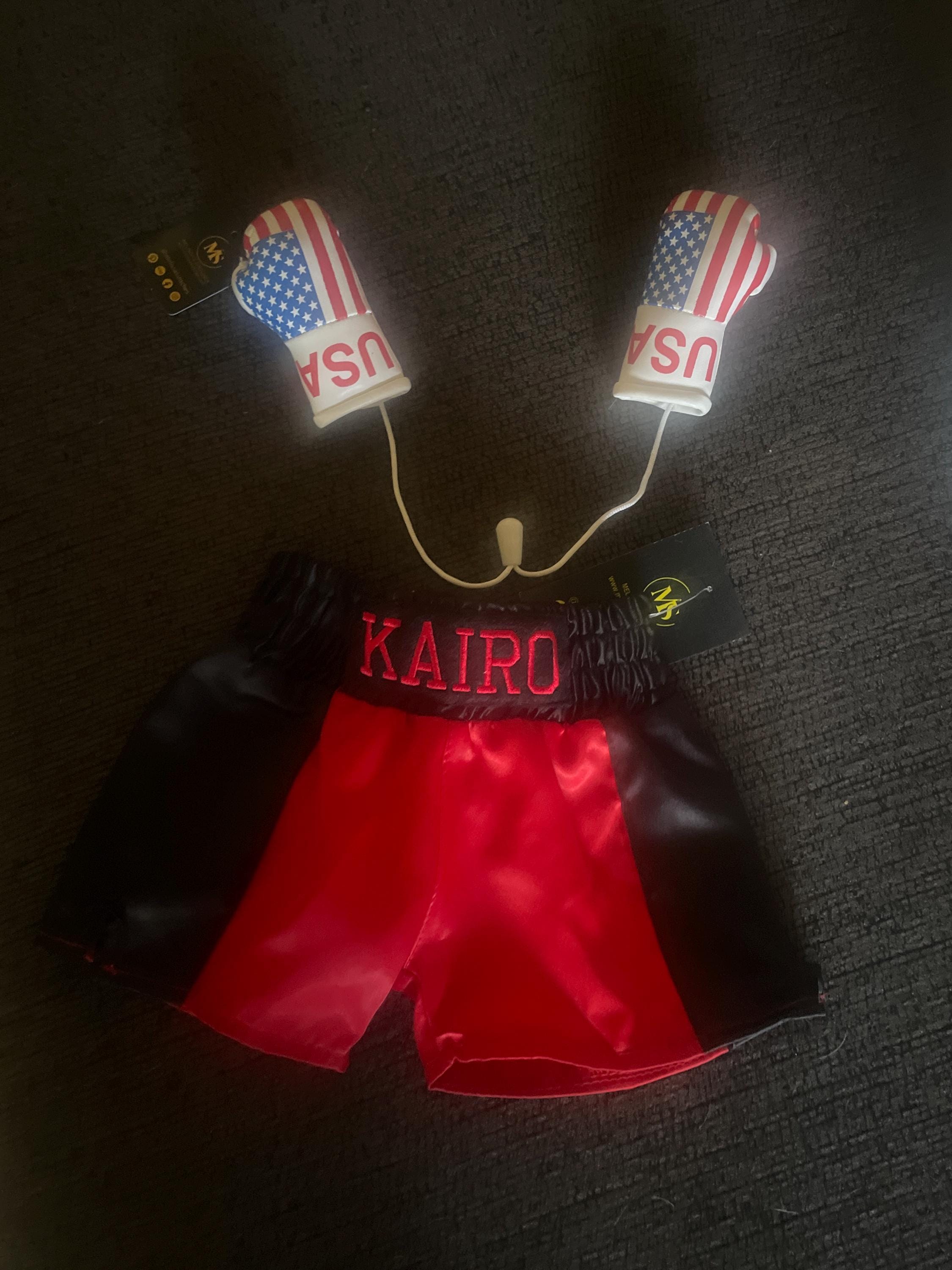 Looking for a knockout outfit for your little one? We've got you covered with this charming baby boxing set. It includes personalized shorts with your baby's name and a pair of prop gloves.