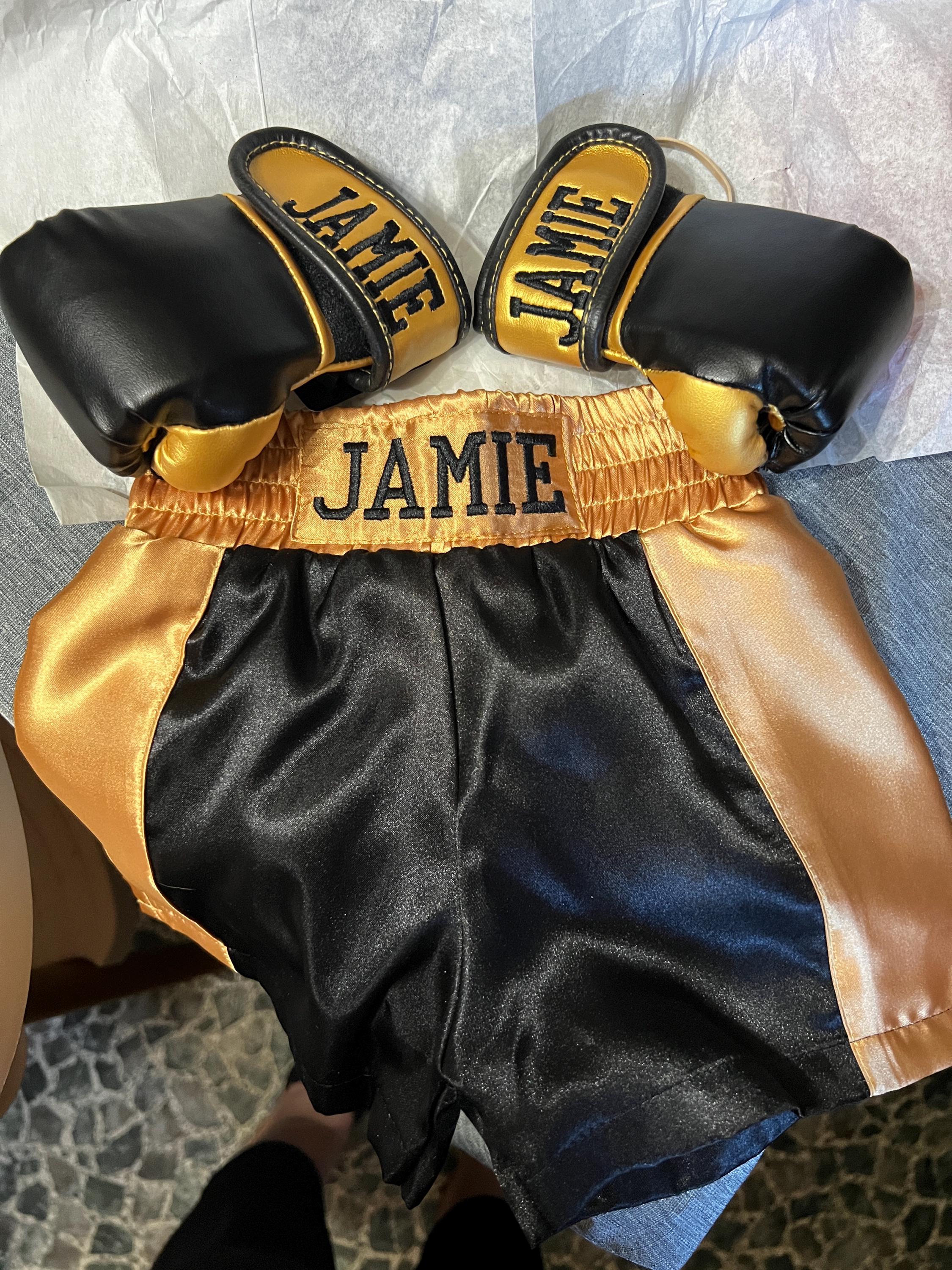 Looking for something extraordinary for your budding boxer? Check out our fantastic Boxing Set! 🌟 It includes shorts personalized with your baby's name and wearable boxing gloves that add the perfect punch of style.