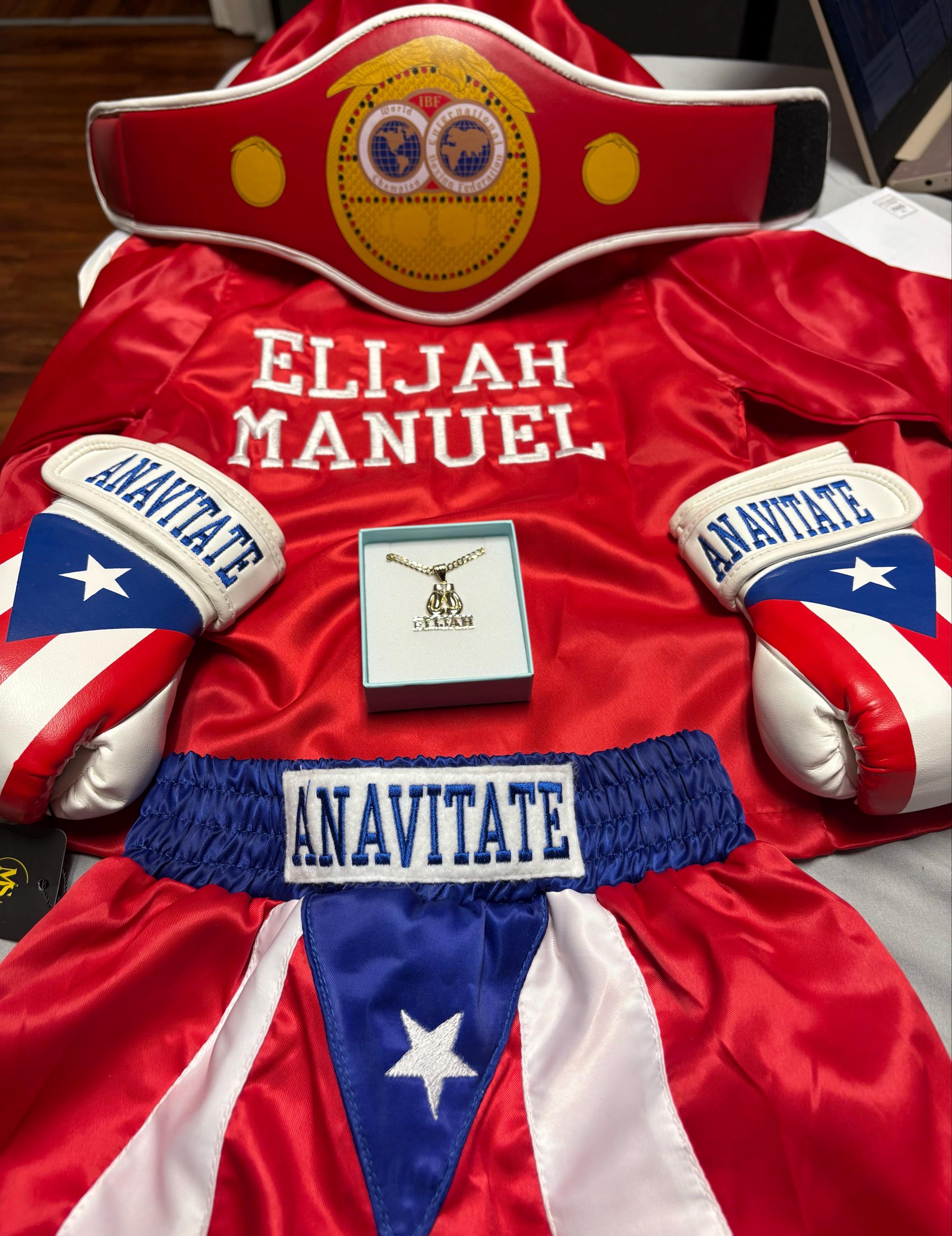 **Note:** This listing is for the robe, personalized shorts, and wearable gloves featuring the Puerto Rico flag. For the complete set and more options, check out our other listings.